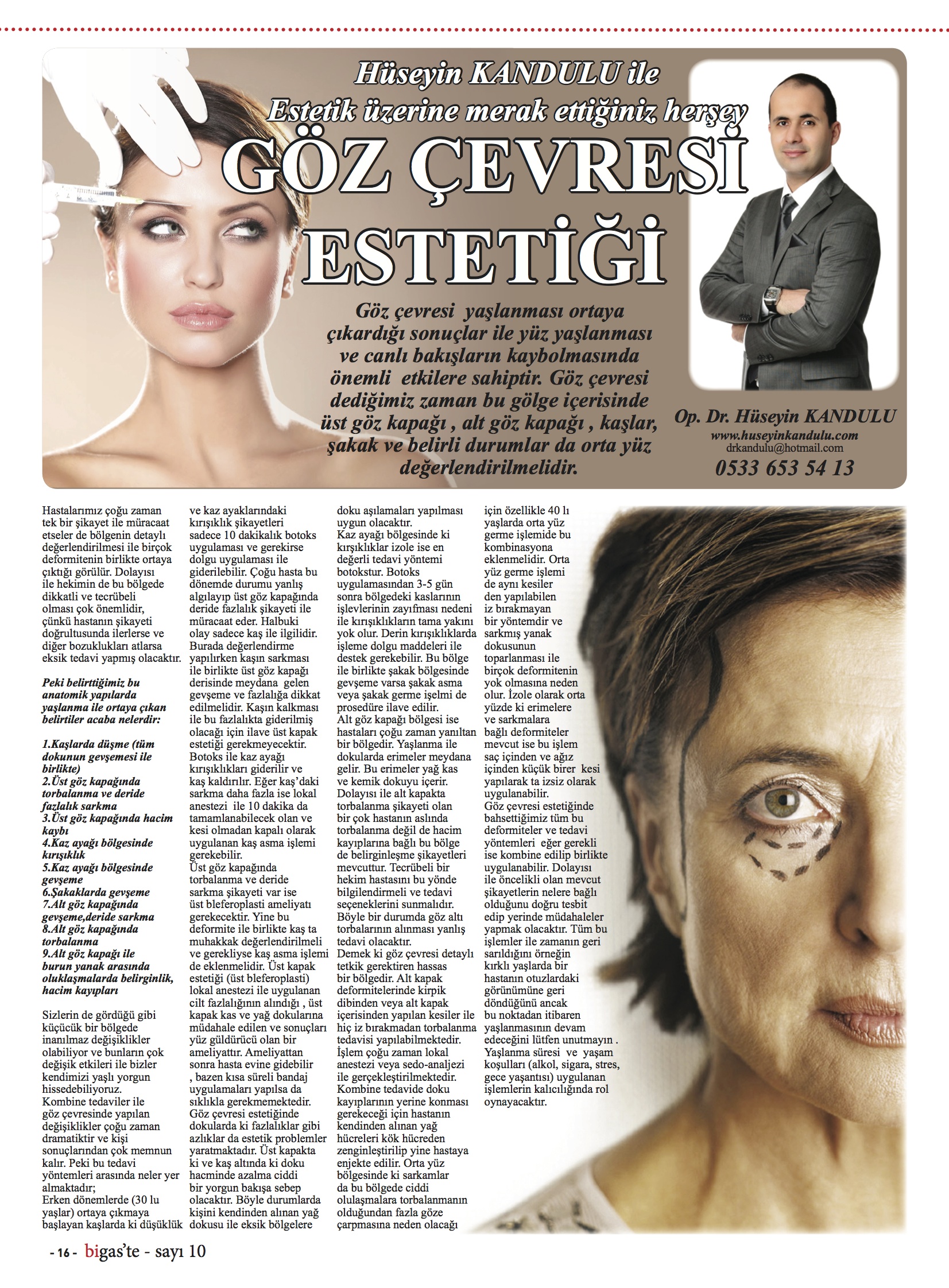 Göz çevresi yaşlanması ortaya çıkardığı sonuçlar ile yüz yaşlanması ve canlı bakışların kaybolmasında önemli etkilere sahiptir. Göz çevresi dediğimiz zaman bu gölge içerisinde üst göz kapağı, alt göz kapağı , kaşlar, şakak ve belirli durumlar da orta yüz değerlendirilmelidir.
