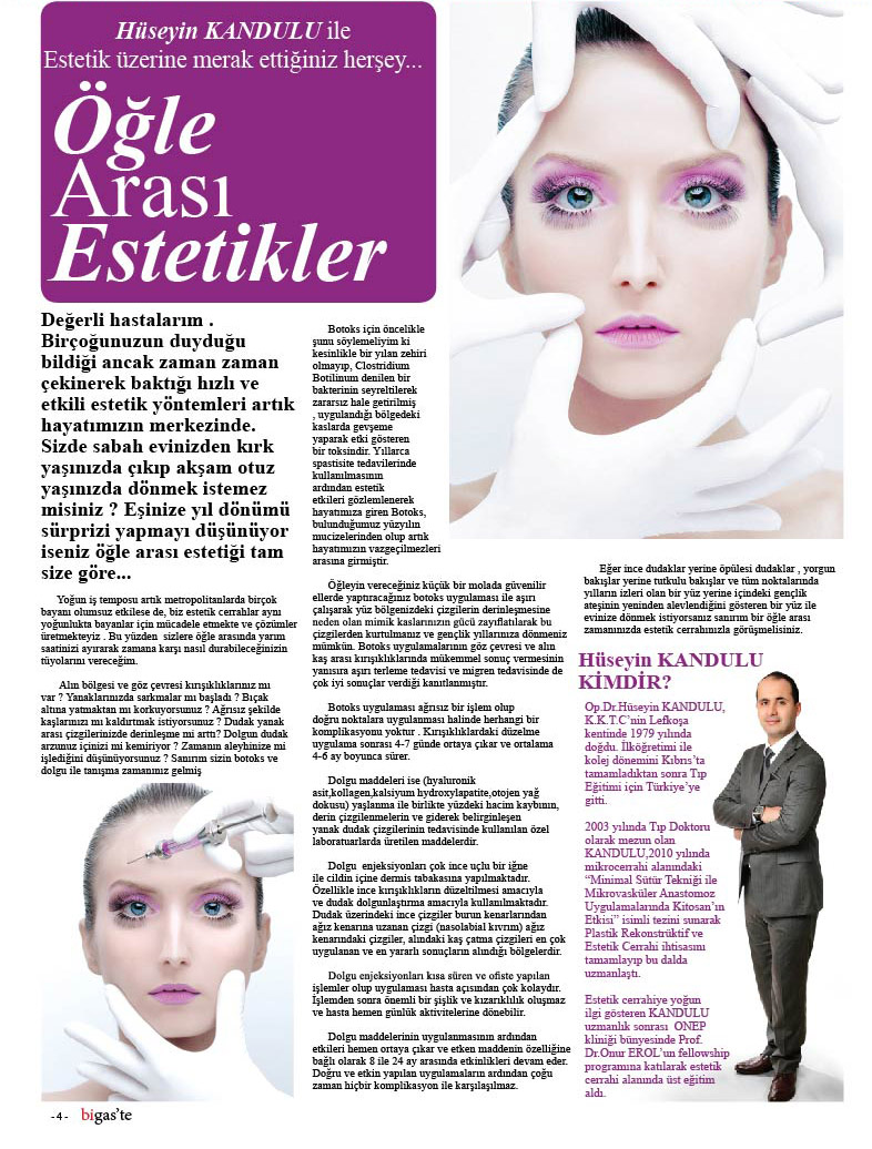 Öğleyin vereceğiniz küçük bir molada güvenilir ellerde yaptıracağınız botoks uygulaması ile aşırı çalışarak yüz bölgenizdeki çizgilerin derinleşmesine neden olan mimik kaslarınızın gücü zayıflatılarak bu çizgilerden kurtulmanız ve gençlik yıllarınıza dönmeniz mümkün. Botoks uygulamalarının göz çevresi ve alın kaş arası kırışıklıklarında mükemmel sonuç vermesinin yanısıra aşırı terleme tedavisi ve migren tedavisinde de çok iyi sonuçlar verdiği kanıtlanmıştır.